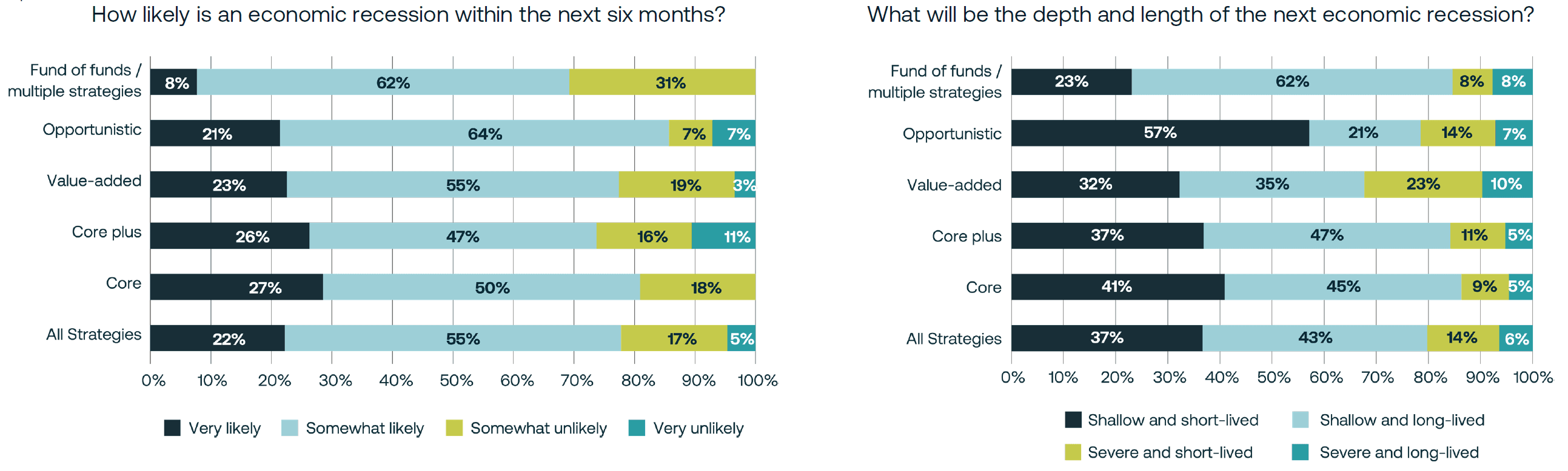 A significant majority of respondents (77%) indicated that a recession is expected in the next 6 months, with 22% expecting a recession to be “very likely” and 55% expecting a recession to be “somewhat likely”. Recession expectations were relatively consistent across different risk profiles and strategies, but were most pronounced among core and opportunistic strategies. More than a quarter (27%) of respondents who identified as having a core strategy indicated that a near-term recession was “very likely”, while more than two-thirds (64%) of respondents who identified as having an opportunistic strategy said a near-term recession was “somewhat likely”. The shape of the next recession is expected to be shallow. While a majority (80%) of respondents expected the next recession to be shallow, the expected duration of the next recession was largely split, with 37% of participants expecting the next shallow recession to be short-lived and 43% expecting it to be long-lived. Expectations for severity (shallow or severe) and duration (short-lived or long-lived) varied most notably amongst the responses from the opportunistic and value-added strategies, which had the largest cohorts of “shallow and short-lived” and “severe” responses, respectively.