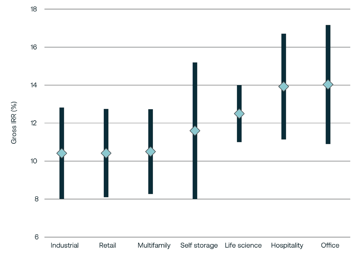 Reported gross IRRs for new funds averaged 11.9% across property types – self-storage had the most varied responses, with a midpoint of 11.6%, but low of 8.0% and high of 15.2%, and marketed office returns topped the IRR ranking with a midpoint of 14% and a wide range of responses (low of 10.9% and high of 17.2%)