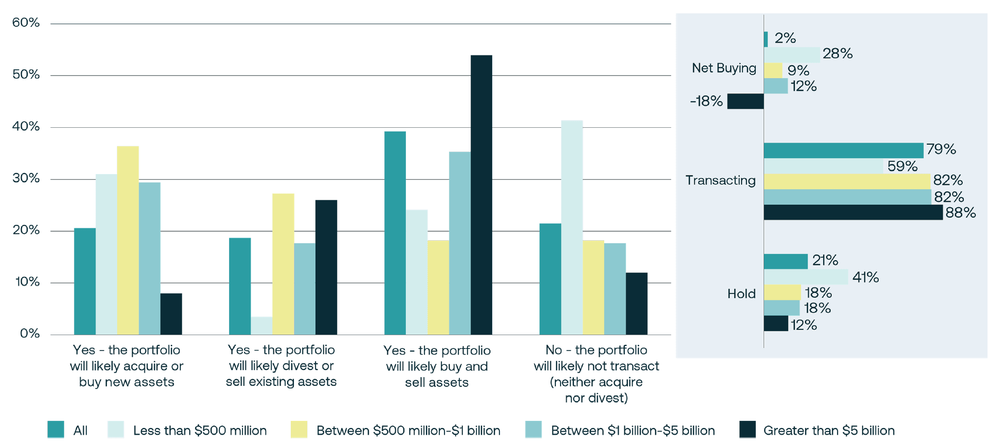 After a prolonged period of muted transaction activity, respondents indicated that the market activity is likely to pick up over the coming 6 months. The majority (79%) of survey participants noted plans of transacting over the next 6 months, though these intentions vary significantly by firm size. Larger institutions (>$5 billion) plan to be net sellers, while smaller firms (<$5 billion) plan to be net buyers.