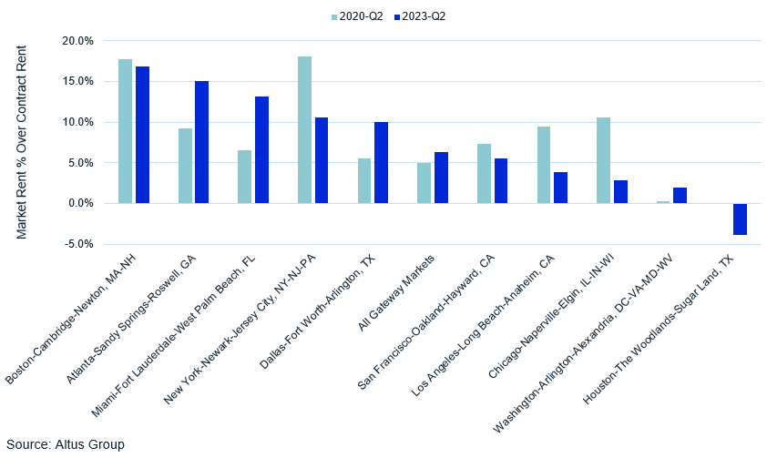 Depuis 2020, l’écart entre les loyers du marché et les loyers contractés sur place s’est élargi à Atlanta (+5,7 %), Miami (+6,7 %), Dallas (+4,5 %) et Washington (+1,6 %), tandis qu’il s’est rétréci à Boston. (-0,9 %), New York (-7,5 %), San Francisco (-1,8 %), Los Angeles (-5,6 %), Chicago (-7,6 %) et Houston (-3,9 %).