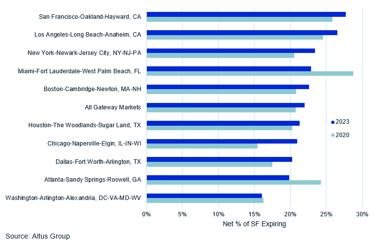 Au deuxième trimestre 2023, tous les principaux marchés de bureaux, sauf trois, auront un pourcentage de surface louable nette expirant au cours des trois prochaines années plus élevé qu'avant la pandémie.