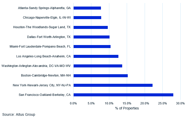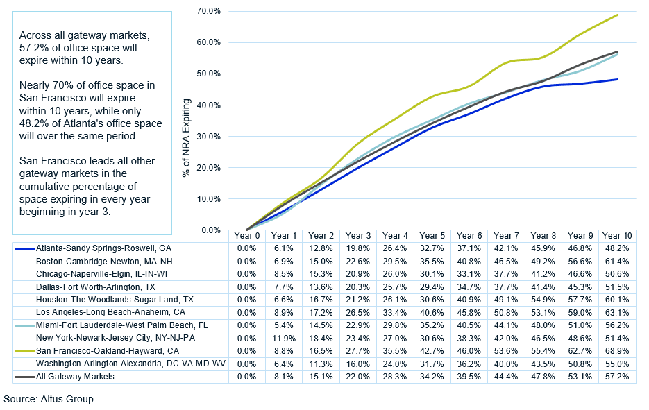 Les trajectoires des surfaces de bureaux cumulées expirant dans les 10 ans varient énormément selon les principaux marchés, avec près de 70 % expirant à San Francisco mais moins de 50 % expirant à Atlanta.