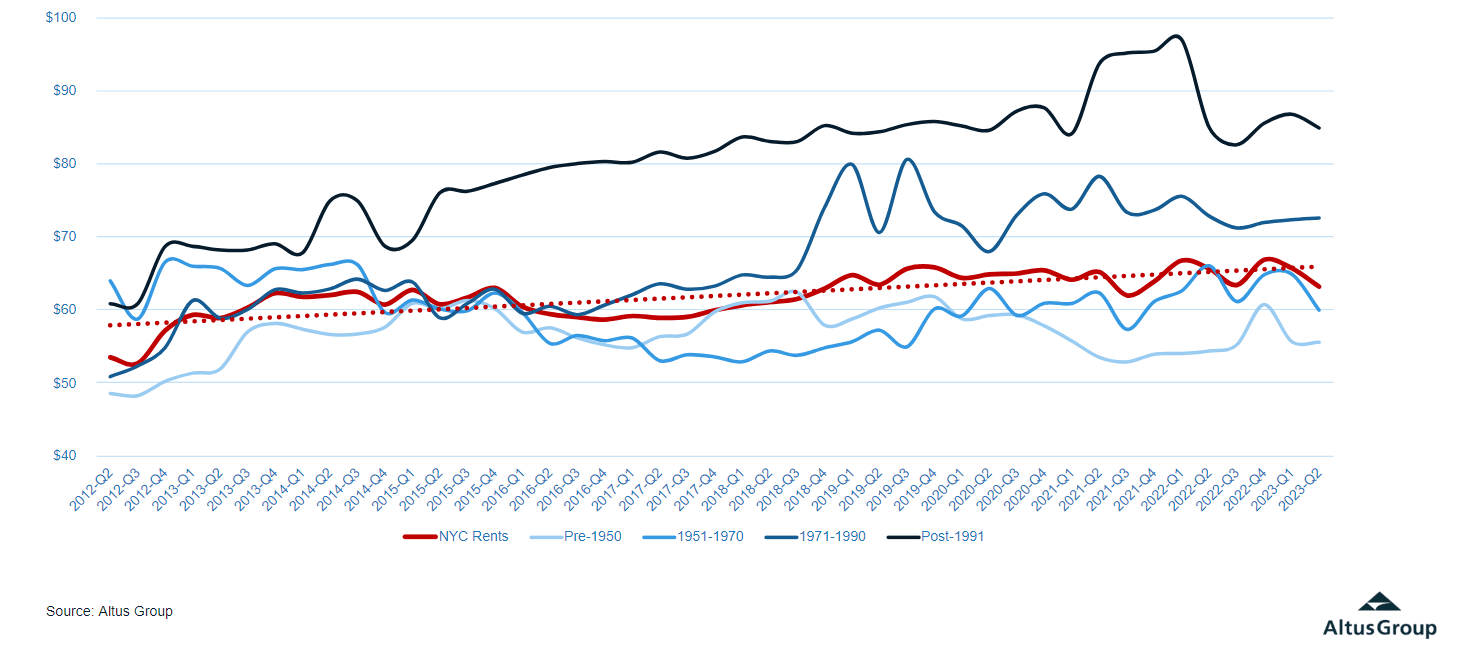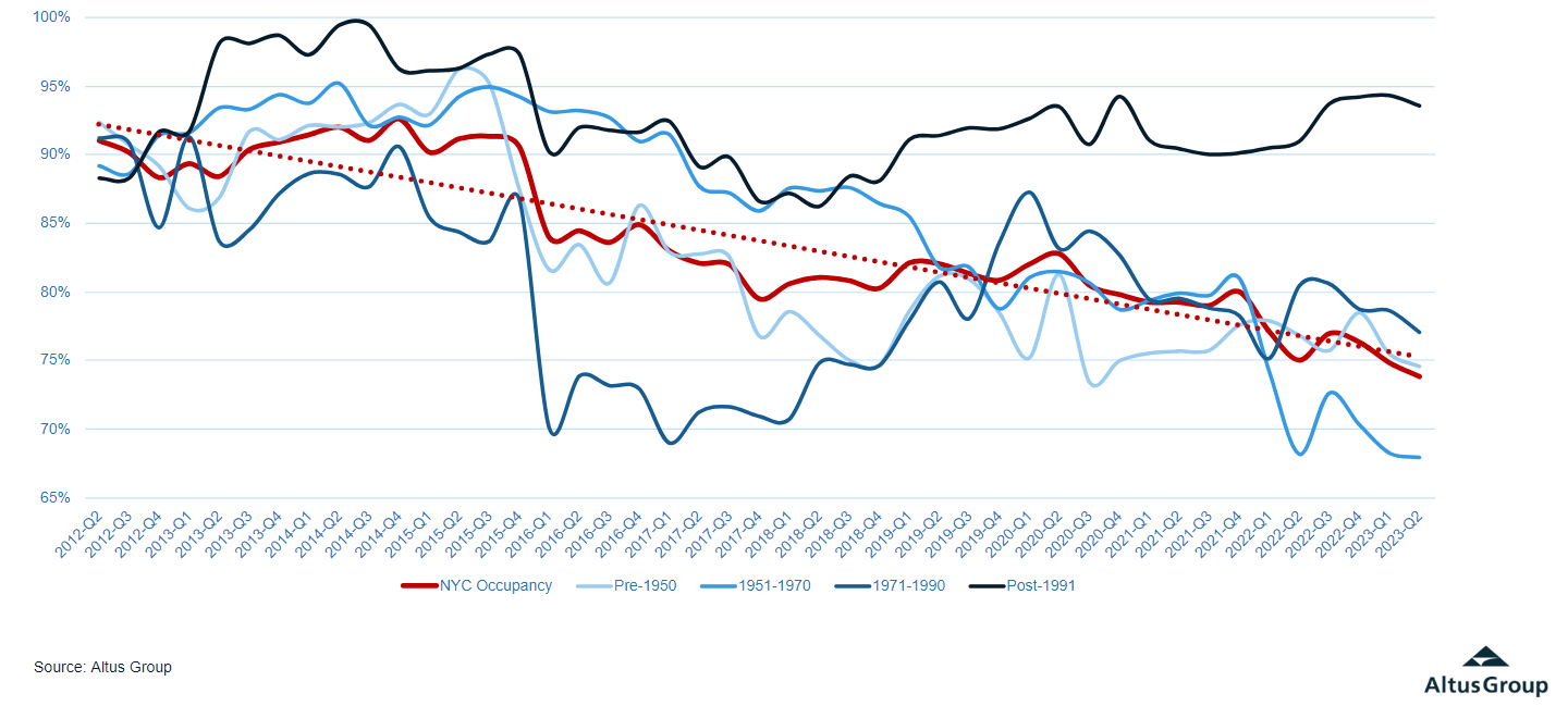 Declining occupancy: NYC office occupancy has been in decline over the last decade, falling from around 90% in late 2015 to mid-70% recently. The declining occupancy rate has been most pronounced across older buildings built before 1991. The newer buildings, built in 1991 or later, have largely bucked the decline, and maintained occupancy above 90%.