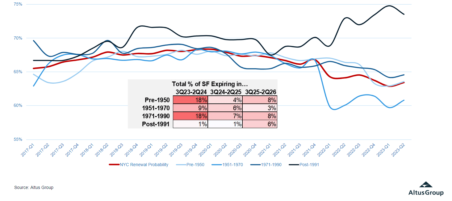 Renewal probabilities diverge: Lease renewal probabilities were largely stable and remained above 65% until 2021. However, over the last two years, renewal probabilities for NYC office have declined, reflecting increased uncertainty with leasing activity. While the overall renewal probability has recently slipped below 65%, this decline has been driven entirely by older office stock. Meanwhile, renewal probabilities for newer buildings have reached new highs recently, around 75%.