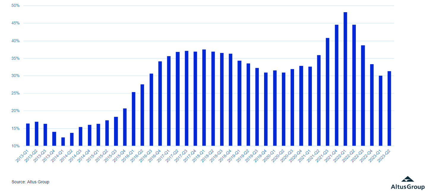 Elevated rent premiums: The rent premium that newer buildings command compared to older building nearly doubled over the decade, to nearly 30%. This premium peaked at 48% in early 2022, before falling back to the recent range of 30-35%.