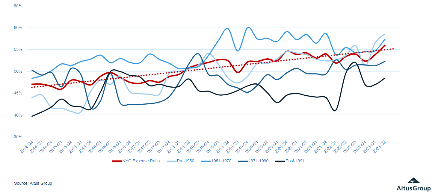 Expense ratios increase: Operating expenses as a percentage of effective gross income have increased nearly 10% over the last decade, from 47% to 56%. While all property vintages have seen expenses increase, the older buildings have seen more substantial increases – closer to 15% over the past decade.