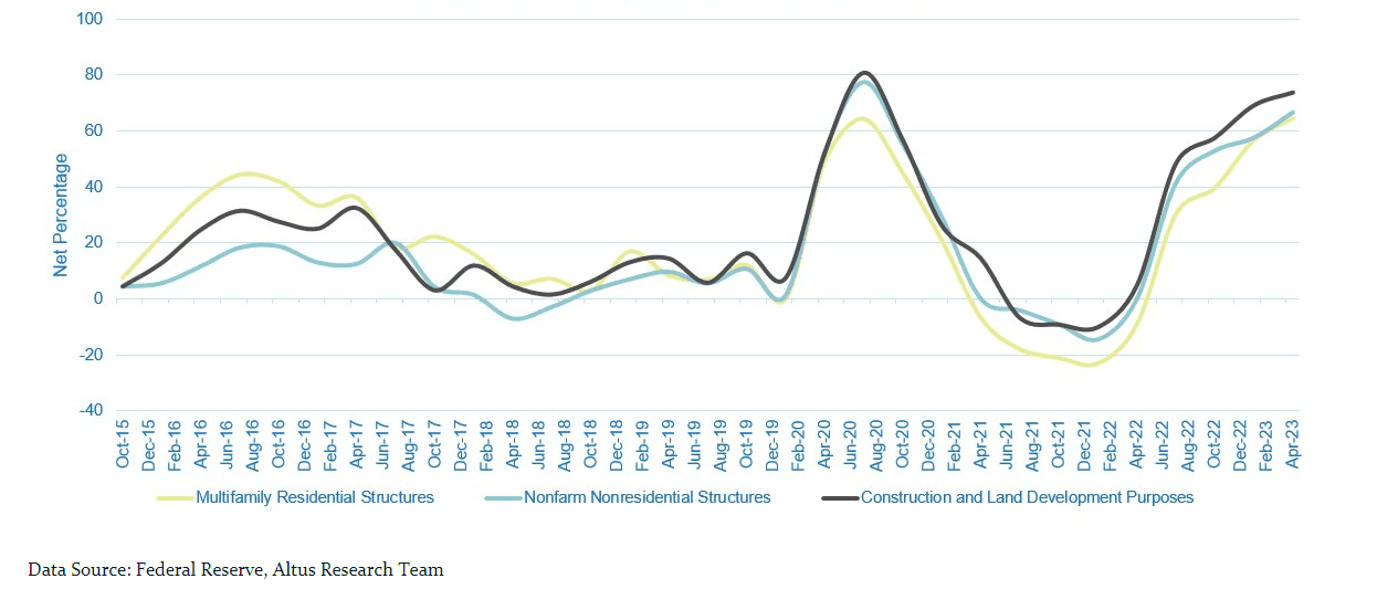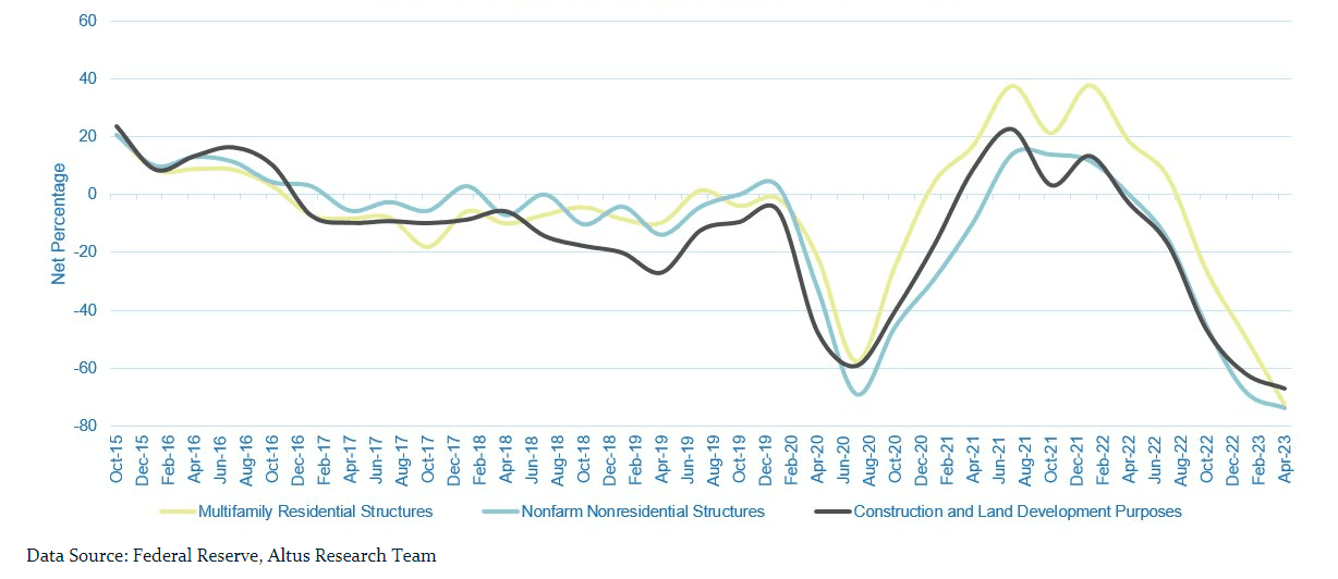 De même, le pourcentage net de ces entités déclarant une forte demande diminué chaque trimestre sur la même période pour tous les types de propriétés CRE. Au deuxième trimestre 2023, le pourcentage net était de -67,2 % pour la construction et le développement, de -72,6 % pour les immeubles multifamiliaux et de -73,8 % pour tous les autres CRE.