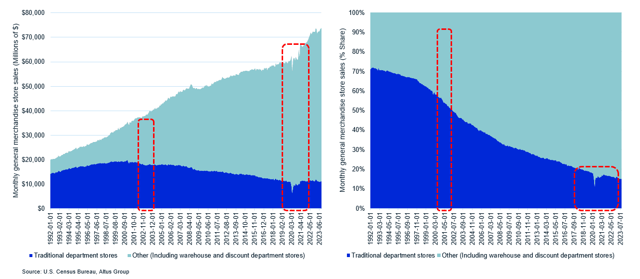Altus Group recently highlighted the challenges “big box” brick-and-mortar retailers face in the wake of online competition. This was demonstrated during the pandemic, during which e-commerce briefly surged past 16% of total sales before returning to pre-pandemic levels of growth in 2023, to just below 14%. However, there’s one facet of the shifting retail landscape that is often neglected: the impact of discount department stores. In 2002, the in-person retail environment was split almost evenly between traditional department stores and these then-new competitors.