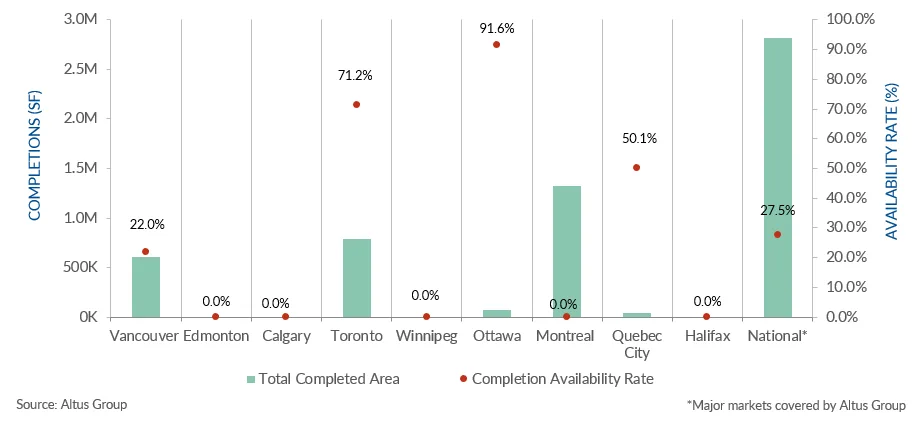 Au quatrième trimestre 2023, 11 immeubles de bureaux avaient été achevés, Toronto étant en tête du pays pour le nombre d'immeubles achevés.