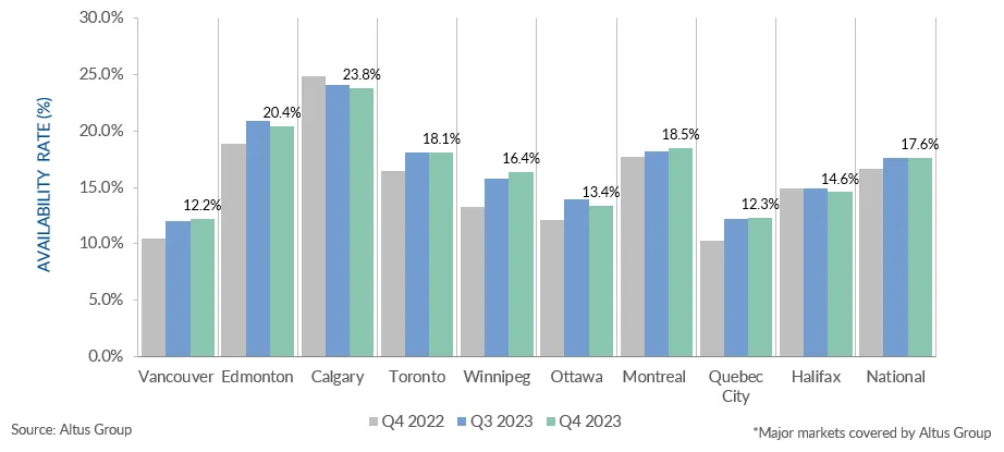 Au quatrième trimestre de 2023, le taux de disponibilité des bureaux nationaux s'est stabilisé partout au Canada, se maintenant à 17,6 % par rapport au trimestre précédent.